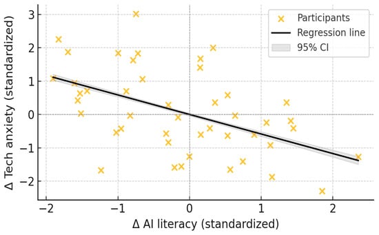 Inverse association between Δ AI literacy and Δ technology anxiety (standardized scores).
