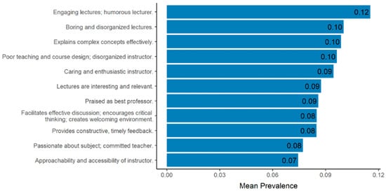 Topic prevalence indicates the proportion of a given comment that is associated with a specific topic. For example, a prevalence of 0.47 for Topic 4 means that 47% of the content in the first comment—“Professor LastName is the most amazing teacher. He is incredibly kind, caring, and truly cares about the success of students.”—is attributed to Topic 4.