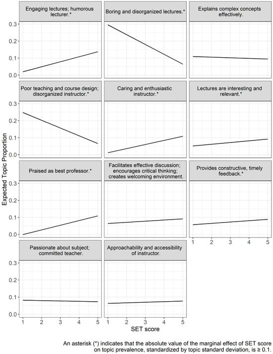 Within education research, the application of STM remains relatively novel. Taylor et al. (2021) applied STM to analyze how student evaluations varied by gender, finding that comments for female instructors were more likely to focus on perceived care and accessibility, while those for male instructors emphasized content mastery and enthusiasm. While they found differences in 15 of the 20 topics identified by the STM analysis, substantively these differences were small (Taylor et al., 2021). Additionally, their study did not examine how topic prevalence related to numeric SET ratings, a key focus of our current analysis.