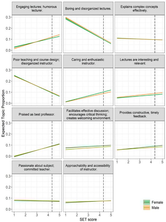 where represents the baseline prevalence of topic k, and is a vector of coefficients , , etc., that measures the effect of each covariate on topic prevalence. For example, captures the impact of having a female instructor (relative to the baseline category of male) on the prevalence of topic k, while represents the interaction effect between being a female instructor and the SET score on the prevalence of the topic.