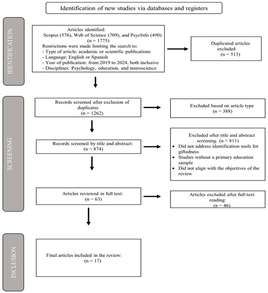 The inclusion criteria were as follows: articles published in English or Spanish, focused on disciplines such as psychology, neuroscience, educational research, family studies, and multidisciplinary fields. Both qualitative and quantitative studies were considered. Studies focusing on the identification of giftedness in adolescent populations or those not focused on identification tools were excluded. Study selection and review were carried out independently by three reviewers. As illustrated in Figure 1, the screening and selection process followed the PRISMA 2020 guidelines (Page et al., 2021). In total, 17 studies that met the objectives of this systematic review were included. The review is registered in PROSPERO under registration number CRD420251064093.
