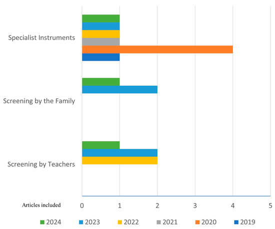 The publication years of the selected articles are presented in Figure 3, along with the number of studies categorized by type of tool. Of these, 52.9% correspond to tools designed to be used by diagnostic professionals, 17.6% by families, and 24.9% by teachers.