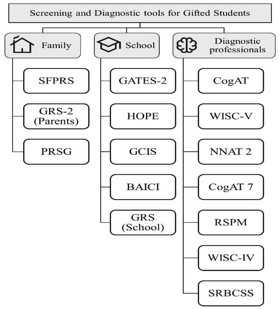 Screening and diagnostic tools for gifted students categorized by user. The tools included in the figure are as follows: Gifted and Talented Evaluation Scales, Second Edition (GATES-2); Having Opportunities Promotes Excellence Scale (HOPE); Gifted Characteristics Identification Scale (GCIS); Battery for Intellectual and Creative Assessment—Child Version (BAICI); Gifted Rating Scales—School Form (GRS-S); Short-Form Parent Rating Scale (SFPRS); Gifted Rating Scales—Parent Form (GRS-2); Parental Rating Scale for Giftedness (PRSG); Nonverbal Cognitive Abilities Test (CogAT); Wechsler Intelligence Scale for Children, Fifth Edition (WISC-V); Naglieri Nonverbal Ability Test, Second Edition (NNAT 2); Nonverbal Battery of the Cognitive Abilities Test, Seventh Edition (CogAT7); Raven’s Standard Progressive Matrices (RSPM); Wechsler Intelligence Scale for Children, Fourth Edition (WISC-IV); Scales for Rating the Behavioral Characteristics of Superior Students (SRBCSS); and the Verbal Battery of the Cognitive Abilities Test (CogAT-V).