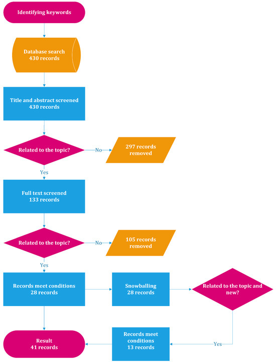 A total of 430 records were identified as suitable for screening. A preliminary screening, which was based on the title and abstract, led to the exclusion of 297 records for various reasons, including obvious irrelevance to the topic and duplication. For the remaining 133, the full text was examined, as shown in Figure 3. During full-text screening, 105 records were excluded because they did not address the research topic, even though the title and/or abstract appeared relevant or the full text of the record was not available. So, 28 records provided the starting set of snowballing, 22 in English and 6 in Indonesian. Applying the two-way snowballing method, which involved both examining the reference lists of these studies and conducting citation analysis to identify publications that cited them, we discovered an additional 4 English and 9 Indonesian records. In total, the hybrid method search yielded 41 relevant records that matched the research topic, 26 in English and 15 in Indonesian. Approximately 9.53% of the total records were included in the sample.