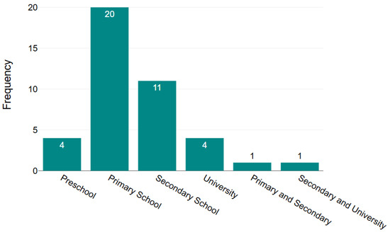 The number of records per educational level is illustrated by a bar chart in Figure 5. Most records relate to the primary school level (48.78%), followed by secondary school (26.82%). There is only one conference paper where the game discussed can be used in primary and secondary education (2.44%). The same number of records deal with games for pre-school (9.76%) and university level (9.76%). Furthermore, in one case (2.44%), both upper secondary and university levels are relevant. In our classification, primary school covers ages 6 to 12, while secondary school covers ages 12 to 18.