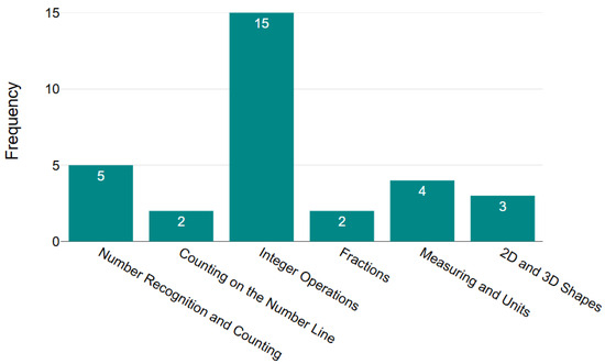 We identified six main topics for which UNO® or UNO-type games can be used as teaching tools in classroom practise at the primary school level. At the preschool and primary school levels, there is an overlap in mathematical topics because knowledge of numbers and counting, progressing step by step up to 10, is also a relevant part of the first-year curriculum in primary school. For this reason, the topic number recognition and counting from 1 to 10 has also been included in the first row of Table 6, but we have added additional content to it. There are numerous overlaps, as some UNO-type educational games belong to more than one topic. The number of records per identified topic is illustrated by a bar chart in Figure 6.