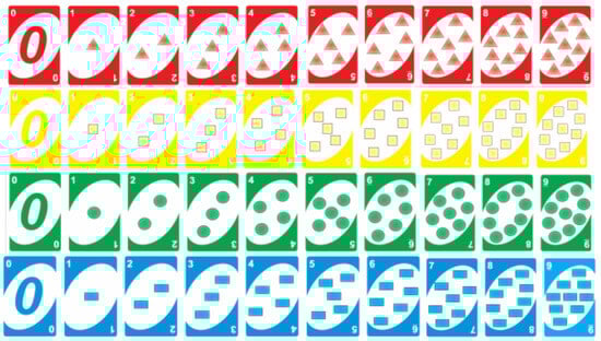The U-Kids card game is a graphic-based educational tool designed to stimulate logical–mathematical intelligence in children aged 5–6 years, created by Kholida et al. (2020). The game incorporates colours, shapes, and numbers. It functions as a type of active learning game that encourages children to use strategic thinking. The game is designed to stimulate a child’s awareness of numbers, with an understanding of the concepts of less and more, arranging things in serial, categorical, and hierarchical ways, analysing objects quickly, understanding numeric symbols, and counting. Instead of numbers, geometric shapes (circle, triangle, square, and rectangle) are depicted on the base cards to represent different quantities, as shown in Figure 7.
