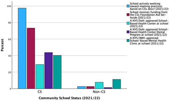 In terms of student support programs and services, community schools had a significantly higher percentage of active and intentional efforts to follow the CS practice guidelines (98% vs. 3%, odds ratio = 1309.96, p < 0.001), set-aside funding (73% vs. 3%, odds ratio = 99.51, p < 0.001), school-based health centers (30% vs. 8%, odds ratio = 4.89, p < 0.001), dental programs (42% vs. 1%, odds ratio = 49.66, p < 0.001), and mental health clinics (39% vs. 11%, odds ratio = 5.40, p < 0.001) than non-CSs (see Figure 1).