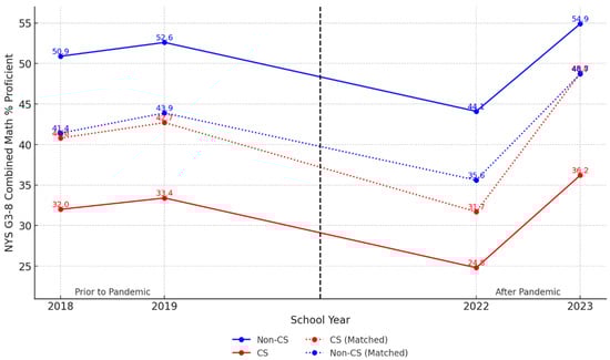 CS vs. non-CS trends of grade 3–8 math proficiency rates (%) during 2018–2023. Note. Solid lines are displayed for ‘unmatched’ trends, whereas dotted lines are displayed for ‘matched’ trends.