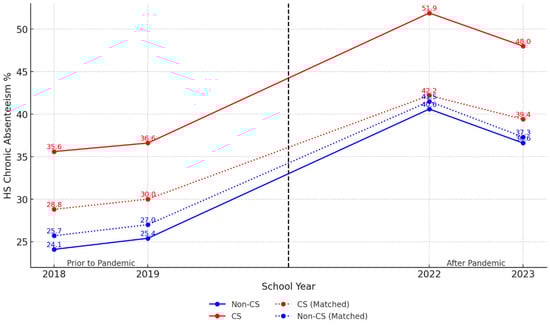 CS vs. non-CS trends of high school chronic absenteeism rates (%) during 2018–2023. Note: Solid lines are displayed for ‘unmatched’ trends, whereas dotted lines are displayed for ‘matched’ trends.