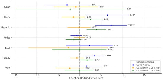 For student subgroup results, we only report high school graduation outcomes here to show evidence on the heterogeneity of treatment effects. We did not find any major subgroup differences for other outcome variables (all other outcome subgroup reports are available upon request). Figure 5 presents subgroup analyses of the IPTW-estimated effects on high school graduation rates. In the binary comparison, Black, Hispanic, and economically disadvantaged students in CSs had significantly higher graduation rates than their counterparts in non-CSs (B = 6.44, SE = 2.53, p < 0.05 for Black; B = 7.29, SE = 1.91, p < 0.001 for Hispanic; B = 3.43, SE = 1.13, p < 0.01 for economically disadvantaged). In the multiple treatment comparison, Hispanic and economically disadvantaged students in two-year CSs also had higher graduation rates than those in non-CSs (B = 3.89, SE = 1.19, p < 0.01; B = 1.71, SE = 0.77, p < 0.05, respectively).