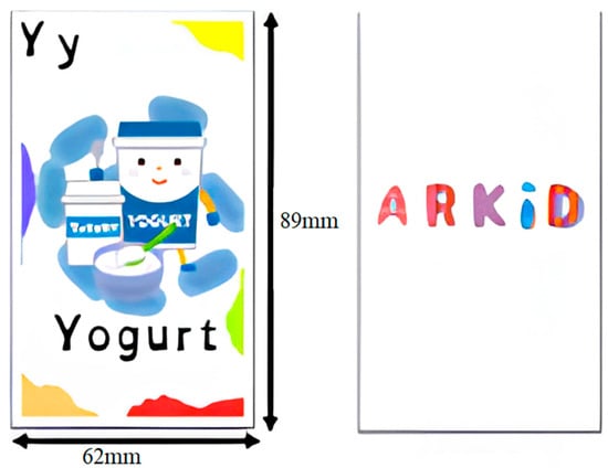 A set of flash cards was designed to learn the letters. Two sets of flash cards were provided to each participant, and each deck consisted of 24 pieces. The size of the flash cards was set at 62 mm × 89 mm. It is necessary to increase the portability of the cards because preschoolers have smaller hands. This could be frustrating when flipping or holding flash cards. The cards act as markers to project 3D visualizations and can be used as educational tools or for entertainment purposes such as memory or matching games. A sample flash card is shown in Figure 4.