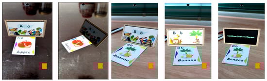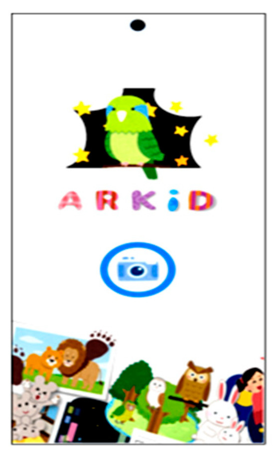 ARKid consists of two scenes: an AR camera and splash screen (Figure 5). The purpose of the splash screen is to conserve battery power because camera usage consumes high loading. Thus, if the preschooler decides to pause while searching for a specific flash card, he/she can return to the splash screen. Figure 6 shows the letters A and B flash cards and their 3D visualizations when the camera is activated.