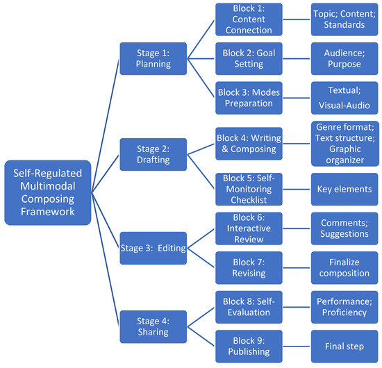 Grounded in SRSD, we integrated self-regulated learning stages into the SRMC framework, including planning, drafting, editing, and sharing. We further embedded nine blocks into the four stages to guide multimodal composing in procedures with detailed descriptions. Each block contains several key components to guide multimodal composing processes, such as content connection, audience awareness, mode affordances, and reflective activities.