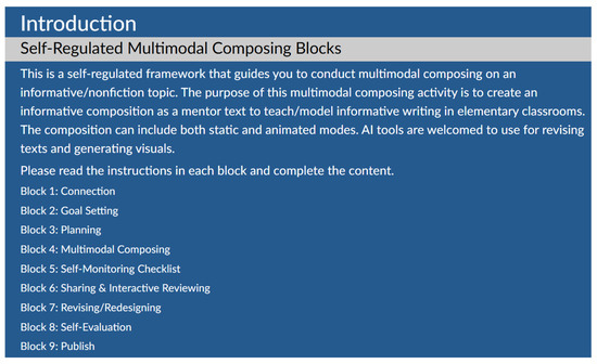 The preservice teachers were given 50 min at one of their regular class sessions to complete the entire module. Although the task was individual work, communication and collaboration with peers were encouraged throughout the process. The blocks guide the preservice teachers in choosing a topic, content area, grade level, and composition format. The composition was intended to align with the grade level’s content and topic suggested by state standards, and the texts should support the elementary students’ comprehension and learning needs. On the front page of the Canvas module, we provided a brief introduction to the multimodal composing task, along with a list of the nine blocks.