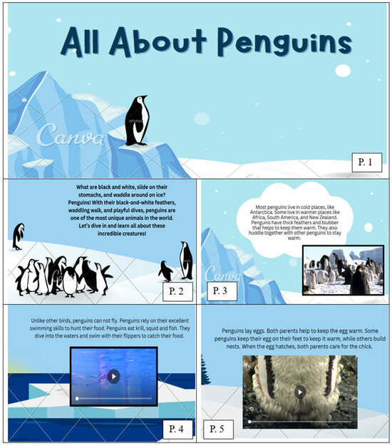 After reading their peers’ comments, learners can revise and finalize their work in Block 7. With the finalized version of the composition, preservice teachers prepare to publish and reflect on their work in the next stage. For example, the preservice teacher who created the composition on penguins received a suggestion to add some interactive modes or videos to the project. Then the preservice made that revision on the final version of the composition (See Figure 5). In the final version of the composition, the preservice teacher created a presentation project on Canva, integrating texts, pictures, and videos to facilitate comprehension of the topic.