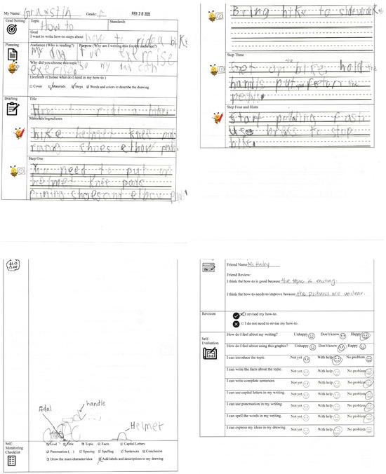 Additionally, in the Spring 2025 semester, we recruited a single classroom of first graders at a charter school in a western state for the present study. The first-grade classroom teacher is a female, White, with over 20 years of teaching experience in elementary schools and more than 6 years of experience teaching first grade. There are 24 students in this classroom, and they all completed the writing task using the self-regulated graphic organizer during their regular class session, which lasted approximately 45 min. The task asked students to write a sequential story that included procedures for making or doing something. On the graphic organizer, students reviewed the blocks and filled out the content. The multimodal composing included text writing and drawing pictures that reflected the written story. A total of 19 students whose parents/guardians have signed the informed consent form indicating their agreement for their child to participate in this study.