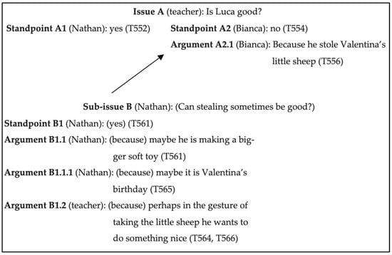 As Figure 2 shows, the issue under discussion is the question that is explicitly asked by the teacher at the beginning of the excerpt. It becomes an argumentative exchange as soon as Bianca disagrees with Nathan’s view and presents her own argument. Bianca asserts that Luca is not a good person because he stole Valentina’s soft toy (turn 556), which presupposes that a person who steals cannot be considered good. Nathan questions whether there could be a valid reason for Luca’s actions, challenging the underlying assumption in Bianca’s argument. Although Bianca does not react to the new discussion point raised by Nathan, interestingly, the teacher does (and even the researcher at the end of the excerpt). In the transcript, we highlighted through an arrow the teacher’s intervention after the opening of the subdiscussion by Nathan. In the analytic overview, we reported it as a further argument supporting Nathan’s position. The teacher’s reaction is to follow up on the proposition by the child, who continues with his reasoning to create a situation where stealing can be justified (he comes up with the idea that Luca is preparing something for Valentina’s birthday), thus saving Luca’s reputation. The teacher’s move has the effect of encouraging the child and giving credit to his claim. Even the researcher supports Nathan’s contribution by reformulating that there might be some good reason why Luca stole the soft toy (turn 575). At the end of this interaction, the other children also seem to accept that Luca might not be that bad.