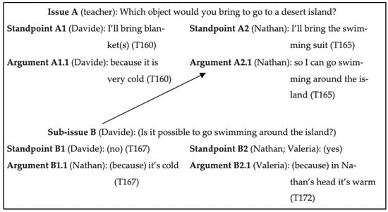 From a procedural point of view, argumentative episodes with the occurrence of a child-initiated subdiscussion have been underlined in the transcripts of the video recordings. Then, we used the analytic overview of a critical discussion () in order to reconstruct the argumentative interaction under examination. As introduced in Section 1.3, the strength of this analytical tool is that it allows one to visualize all pertinent elements in an argumentative exchange. Together with the identification of the parties of the discussion, the standpoints, the arguments, and their structure, we also indicated the issues and the sub-issues, so to be able to distinguish between discussion and subdiscussion(s)9. Digits are used to distinguish standpoints and arguments, while letters indicate issues. Finally, an arrow is used to link the sub-issue to the argument that is challenged by the child opening the subdiscussion.
