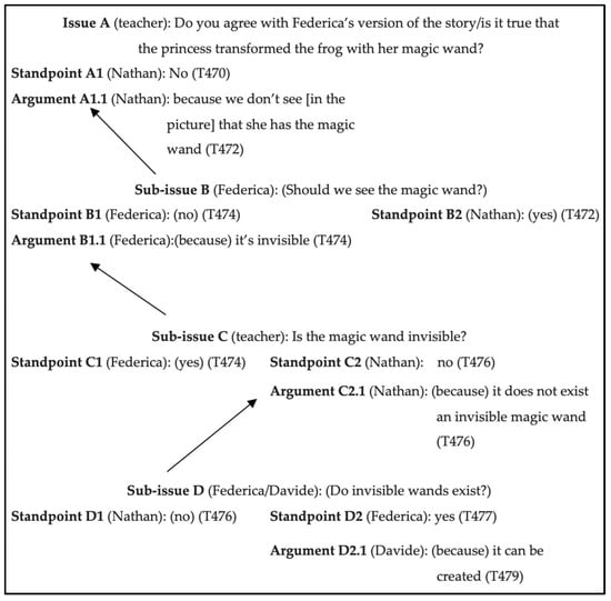As it is portrayed in Figure 4, the exchange becomes argumentative as the teacher asks the other children whether they agreed with Federica’s version of the story (issue A) and Nathan disagrees. According to Federica, the princess made an enchantment with her wand, and she transformed the frog into a prince (turn 468). Nathan is not satisfied with Federica’s story, and after being prompted by the teacher, he argues that there is no magic wand in the pictures, so Federica’s idea cannot be right. Federica reacts by claiming that the magic wand is invisible, which challenges Nathan’s argument and creates a subdiscussion concerning the possibility of seeing the wand in the pictures (sub-issue B).