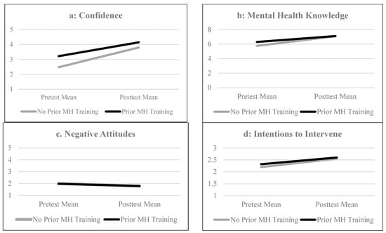 Figure 1b displays trends for mental health knowledge across training groups. Compared to the group with prior mental health training, the group with no training had a lower average score on the pretest survey, however these differences diminished after completion of the YMHFA training program (MD across training groups at pretest = 0.77, SE = 0.24, p < 0.01; MD across training groups at posttest = 0.05, SE = 0.12, p = 0.68). Figure 1c plots the pretest and posttest means for negative attitudes. No meaningful changes in negative attitudes were observed from pretest to posttest (F [1] = 2.10, p = 0.15, ηp2 = 0.01) and this was consistent across training groups (between-subjects effect: F [1] = 0.57, p = 0.45, ηp2 = 0.00). Figure 1d plots the pretest and posttest means for intentions to intervene. Although intentions to intervene showed statistically significant improvements after the training among the full sample, prior training history did not interact with time in a meaningful way (F [1] = 3.35, p = 0.07, ηp2 = 0.01).