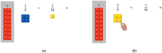 Screenshots of the problem 1/4 ÷ 1/16 = in the Fraction Division lesson: (a) LEGO bricks representing the whole, the dividend, and the divisor; (b) four divisor bricks covering the dividend brick.