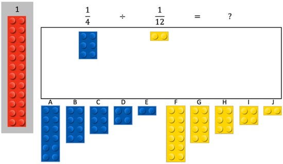 A meaningful explanation of fraction division involves measurement division concepts, specifically, determining how many times the divisor fits into the dividend (Barnett-Clarke et al., 2011; Gregg & Gregg, 2007). In the context of measurement division, the divisor is conceptualized as a unit of measure to determine the size of the dividend (Zembat, 2017). In elementary mathematics instruction, however, fraction division is frequently taught using the “flip and multiply” algorithm, often without presenting associated concepts that explain why the algorithm works (Olanoff et al., 2014). To address this typical shortcoming in the teaching of fraction division, teacher educators have recommended the use of visual representations (e.g., bar diagrams) to enhance students’ understanding of measurement division concepts when learning fraction division (Barnett-Clarke et al., 2011; Reys et al., 2015). Both physical LEGO bricks and images of bricks can serve as useful visual tools in this context (e.g., Tellos & Osana, 2025; TheDadLab, 2019). LEGO bricks can depict the whole, the dividend fraction, and the divisor fraction, facilitating the process of determining how many times a divisor brick can be stacked onto a dividend brick to reach a solution. In an exploratory study, Tellos and Osana (2025) provided instruction to fifth- and sixth-grade students on how to use images of LEGO bricks to solve fraction division problems (e.g., 1/4 ÷ 1/16 =). An error analysis suggested that 18% of the sample inappropriately counted the studs on the bricks rather than the bricks themselves, which may have been one of the reasons they had difficulty applying concepts of measurement division on a transfer task administered after the instruction.