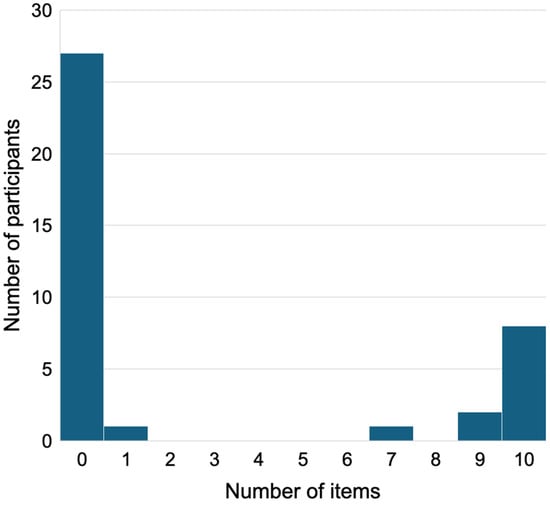 With items as the units of analysis, participants across both conditions counted the studs on over one-quarter of all items (106 of the 390 items or 27%) on the Extraneous Details task. We next switched to an analysis with participants as the units of analysis. Figure 5 presents the frequency distribution of the participants who counted the studs on the task. Almost one-third of the sample (12 participants, 31%) counted the studs on at least one item, whereas eight (21%) counted the studs on all 10 items. These data suggest a bimodal pattern where 35 participants (90% of the sample) either counted the studs on all (23% of the 35 participants) or none (77% of the 35 participants) of the items.