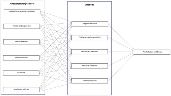 Mental health difficulties in university students are an increasing concern, especially after the COVID-19 global crisis. This study used a cross-sectional design to analyze the effect of psychological factors on students’ psychological well-being. Participants were 190 university students enrolled in undergraduate or graduate programs at a public university. Based on previous research and grounded theoretical models, a conceptual model was proposed to analyze the influence of affect states/experiences (emotion regulation difficulties, anxiety and depression, perceived stress, self-compassion, gratitude, and satisfaction with life) on psychological well-being, including the indirect effect of emotions (negative emotions, positive activation emotions, self-efficacy emotions, prosocial emotions, and serenity emotions), using a path analysis. Multigroup analyses were also performed to test the moderating effect of gender and education level. Findings indicated that self-efficacy emotions had an indirect effect on the relationship between anxiety and depression, self-compassion, and psychological well-being. Both prosocial and self-efficacy emotions indirectly impacted the relationship between gratitude, satisfaction with life, and psychological well-being. Being a female and a bachelor student played a moderating role in the final model. The findings suggest that psychological interventions focused on self-efficacy and prosocial emotions are needed to increase psychological well-being in university students.