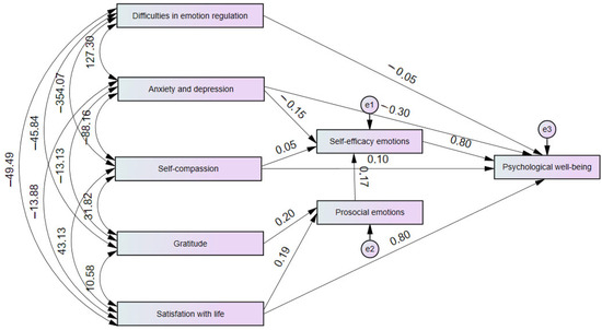 The estimated values of the fit indices in the initial model indicated that the RMSEA index was not acceptable, and several pathways (covariances) between the variables were not significant, undermining the adequacy of the model’s global fit: χ2/DF = 2.31, GFI = 0.99, CFI = 0.99, TLI = 0.95, RMSEA = 0.08 [0.03, 0.14]; SRMR = 0.02. Subsequently, several pathways were explored according to the modification indices, the significance of the path coefficients, and the final model adjustment. Specifically, the non-significant paths (p < 0.05) were removed. After their removal, five modification indexes remained and were taken into consideration, resulting in the addition of direct relationships between the independent variables (emotion regulation, anxiety and depression, self-compassion, and satisfaction with life) and PWB, as well as between prosocial and efficacy emotions (Figure 2). The adjusted model revealed a strong model fit: χ2/DF = 1.09, GFI = 0.99, CFI = 0.99, TLI = 0.99, RMSEA = 0.02 [0.00, 0.09]; SRMR = 0.03.