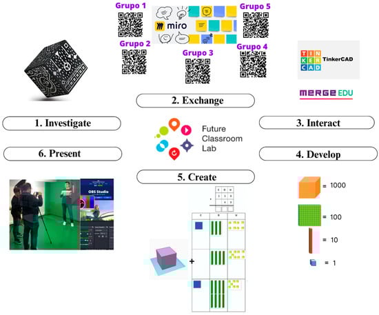 First, in the (1) ‘investigate’ area, PSTs explored the websites and materials needed for performing the intervention. The students had to access the Merge Cube and Tinkercad official websites, create an account, and download the apps to investigate the pedagogical opportunities offered by these learning tools. Once the information was collected, the teacher provided the materials. Finally, PSTs completed a content questionnaire as a formative activity and assessed their learning process. In the (2) ‘interact’ learning area, students cooperated with their classmates to think about how to design the four elements of a multibase block (units, tens, hundreds, and thousands) on the Tinkercad 3D design website. Then, students needed to display these elements throughout the interactive AR device, Merge Cube. In the (3) ‘develop’ learning zone, students created a 3D design of the four elements of the multibase block on the Tinkercad website. The students needed the following learning tool and application to conduct the activity: Merge Cube and the Object Viewer application. Additionally, an example video tutorial facilitated the PSTs’ completion of the activity, helped to perform different arithmetic operations and represent them with the multibase blocks through AR. In the (4) ‘exchange’ learning zone, students interacted in order to come up with the conclusions and results obtained, PSTs brainstormed ideas with the classmates about the learning outcomes throughout the session, and their ideas about using the technological learning tools in the FCL. Finally, the (5) ‘create’ area was used to record students’ presentations in the Chroma room and elaborate a final video using an editing software. The video was the product that reflected the students’ learning process, and results of this session can be assessed by the teacher to perceive the students’ progress. Finally, in the (6) ‘present’ area, the students orally reported the findings obtained during the intervention (see Figure 2).