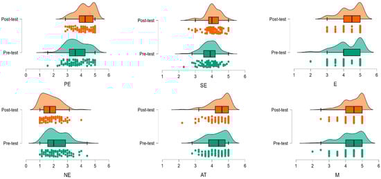 Likewise, the normality Kolmogorov–Smirnov test was applied, revealing that the data collected was non-normally distributed (p < 0.05) for each construct. Thus, non-parametric statistical tests were applied (U-Mann–Whitney test). Additionally, the software JASP (version 0.19.3.0) was used to obtain the data and elaborate the raincloud plots median comparison of pre- and post-tests. Finally, the qualitative data was collected through online questionnaires, and the responses were analyzed through WebQDA software (version 3.0) to obtain the frequency of words to visualize the results obtained.