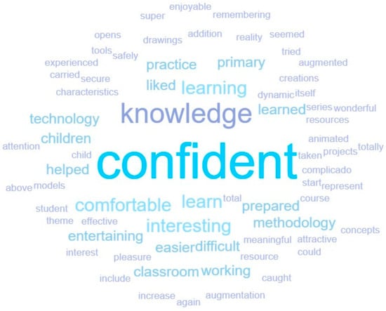 Qualitative research was conducted to identify the students’ confidence in the use of 3D design and AR applications to create multibase blocks as a learning strategy to support the teaching–learning content of arithmetic operations in a mathematics course. The data was collected through online questionnaires and the responses were analyzed through WebQDA software (version 3.0) to obtain the frequency of words and create the word cloud to visualize the results obtained (see Figure 4).
