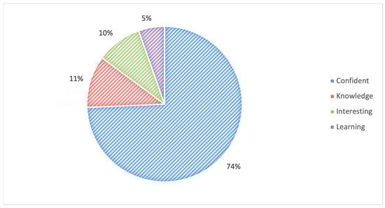 Additionally, the PSTs’ responses about the intervention were analyzed in terms of the most repeated words, and the relative frequency of each word was calculated. Finally, the PSTs’ responses are shown in Table 7, identifying the students with codes to maintain students’ anonymity. Most of the students reported to be more confident in using 3D design and AR educative tools to learn mathematics concepts (74%) and perceived to have gained more knowledge (11%). As well, they found the tools to be interesting (10%) and they enhanced their learning process (5%) (see Figure 5).