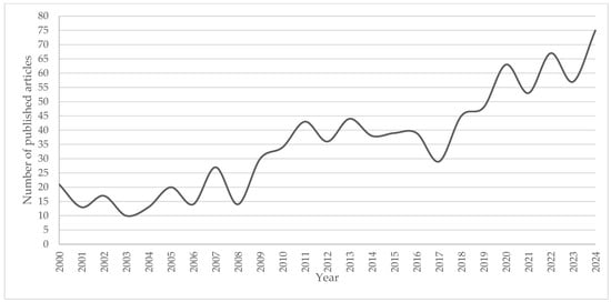 Analysis of data on academic production related to the promotion of educational practices through GISs in the context of RTD reveals a progressive and interesting evolution of this research field (Figure 1). Over the 24 years covered, from 2000 to 2024, the number of annual publications has shown an increasing trend that reflects the rise in the interest and application of GISs in the educational field. This growth is related to both technological advances and the growing recognition of the potential of GISs to improve educational decision-making, optimize management, and offer innovative solutions to current educational challenges.