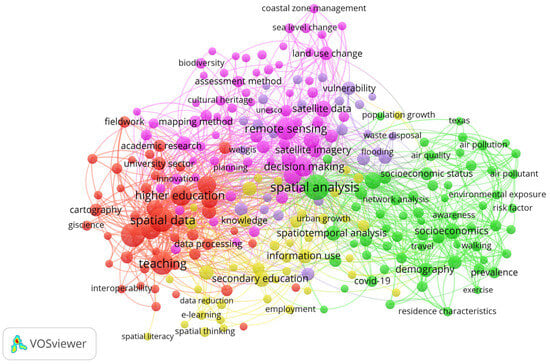 To further analyze the data, VOSviewer (version 1.6.20, Leiden University, Leiden, The Netherlands) was used to create network maps that visualize the frequency and co-occurrence of terms across different publications. These maps also depict the intensity of relationships between concepts, with link strength indicating the number of articles that present terms together (Van Eck et al., 2010; van Eck & Waltman, 2010). This co-occurrence analysis facilitated the identification of dominant and emerging research lines, providing insights into the academic discourse surrounding GIS in education.