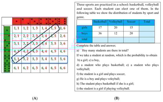 Figure 3. Two-way tables representing (A) the sample space in a compound experiment consisting in throwing two dice; (B) data from a compound experiment used to facilitate discrimination between simple, compound, and conditional probabilities. (A) (reproduced from Colera et al., 2023c, p. 224). (B) (reproduced from Colera et al., 2023d, p. 324).