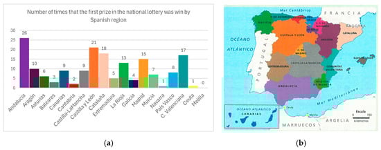 Figure 4. Number of times that the first prize in the national lottery was win in different Spanish regions displayed in (a) a bar chart and (b) a cartogram. (a) (reproduced from Almécija et al., 2022, p. 282). (b) (reproduced from Almécija et al., 2022, p. 283). - Pie charts. These graphs use a circle divided into circular sectors, each of which is proportional to the relative frequency of a modality of the variable represented.