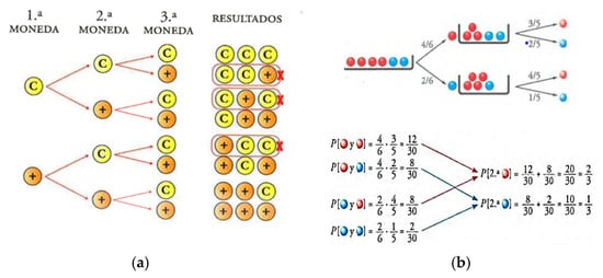 - Tree diagrams. In these graphs, starting from a first vertex or trunk, different paths or branches are born representing all possibilities and branch out if necessary. Its use in the study of probability was promoted by Fischbein (1975), who indicated that it allows the representation of the mathematical structure of many probability problems and is therefore a productive resource for their resolution. We found two different uses in the textbooks: First, the tree diagram is employed as an aid to the enumeration of all the elements of the sample space in a compound experiment, as shown in Figure 5a. Second, a different application of the tree-diagram is shown in Figure 5b, where the diagram displays the steps in solving compound probability problems, including representations of the events involved in the problem.