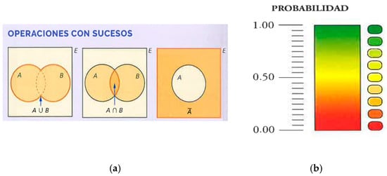 Figure 6. Representations of (a) Venn diagrams to introduce operations with events; (b) scale of probability. (a) (reproduced from Alejo et al., 2023c, p. 186). (b) (reproduced from Alejo et al., 2023c, p. 225). - Probability scale. In this scale, the probability of an event is represented within an interval between zero, which corresponds to an impossible event, and one, which is assigned to a certain event. It is used so that the student qualitatively assigns probabilities to the events of an experiment by placing them physically on the scale. Sometimes, as in Figure 6b, graduation marks and some values are added (in the example, the values 0, 0.5, and 1 have been added).