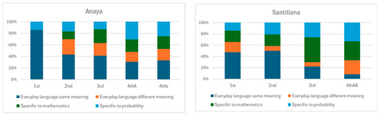 Table 2 summarizes the number of terms of each type introduced for the first time by grade level in each publishing house. Figure 8 presents this data in a stacked bar graph. As shown in Table 2, the number of everyday language terms exceeds that of specialized terms, particularly in grades 1 and 2, for both Anaya and Santillana. The number of probability-specific terms and general mathematical expressions is comparable across both publishers.