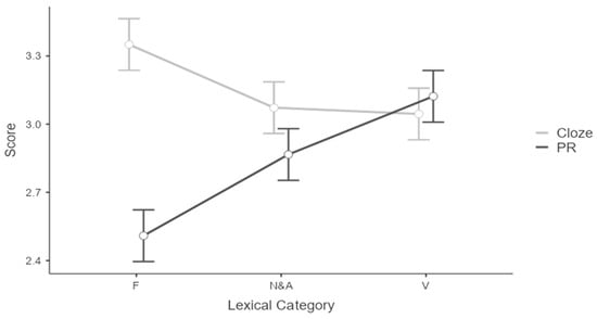 In contrast, in the proof-reading (PR) task, both nouns and adjectives [Estimate = 0.36, SE = 0.06, t(1719) = 6.108, p < 0.001] and verbs [Estimate = 0.62, SE = 0.06, t(1719) = 10.39, p < 0.001] outperformed function words. To further investigate the differences between tasks, the post-hoc analysis adjusted with Bonferroni for the Type I error was carried out on the task variable. Results showed higher scores obtained in the cloze task compared to the proof-reading task, with a mean difference of 0.32 points [SE = 0.04, t(191) = 7.92, p < 0.001].
