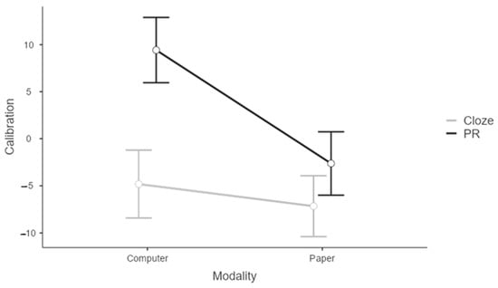 The ANOVA for the simple effects of modality showed that while during the cloze task differences between modalities did not emerge [Estimate = −2.34, SE = 1.47, t(231) = −1.59, p = 0.112], during the proof-reading task students showed less overconfidence on the paper-based task compared to the computer-based one [Estimate = −12.05, SE = 1.47, t(231) = −8.198, p < 0.0001].