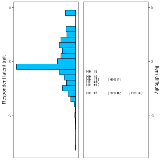 To evaluate the reliability of this scale, Cronbach’s alpha coefficient was computed for all the instrument’s items. The results in Table 3 indicate that HHI was highly reliable, with a Rasch item reliability of 0.886. Notably, all items have a Cronbach’s alpha value lower than the global alpha. The validity of each item on the scale may be confirmed by its correlation with the overall scale. Corrected item–total correlation varied from 0.550 (Item 9) to 0.731 (Item 12).