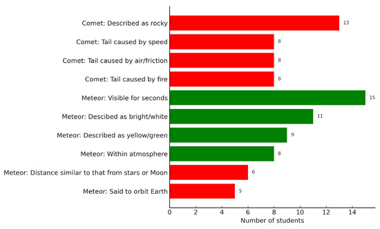 Students’ conceptions and misconceptions about comets (N = 18) and meteors (N = 17). Green bars indicate correct ideas; red bars highlight misconceptions.