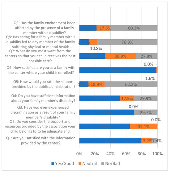 This study employed semi-structured interviews, combining straightforward questions and open-ended ones. Some questions expected a simple “yes/no/neutral” response (e.g., Q1. Are you satisfied with the information you have received from the center?; Q3. Have you ever experienced discrimination as a result of your family member’s disability?), while others elicited responses along ordinal scales such as “good/regular/poor” or “much/little/regular” (e.g., Q5. How good is the support provided by the public administration?). Regardless of format, responses were analyzed quantitatively by coding them as positive, neutral, or negative, as shown in Figure 1. While most participants provided direct responses, when no explicit answer was given, the quantitative category was inferred from accompanying comments or elaborations. Additionally, many questions generated qualitative data, as participants often offered justifications or further explanations, which were subsequently analyzed through thematic coding.