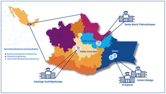 Figure 1 shows the geographical distribution of the ITVE’s distance education nodes in Oaxaca: Santa María Tlahuitoltepec (Sierra Norte), El Espinal and Unión Hidalgo (Isthmus), and Santiago Suchilquitongo (Valles Centrales). This last node houses the main headquarters, from where it coordinates the academic, technological, and administrative operations of the academic programs. This node serves as a nucleus of educational innovation that guarantees the quality and relevance of the offer in the virtual modality.