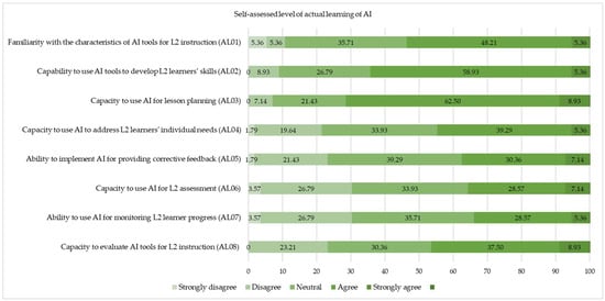 The highest level of agreement was observed for lesson planning with AI applications (AL03), with 62.50% expressing confidence in this area. However, the self-reported competence levels were lower for more complex pedagogical applications of AI (AL04–AL08). For instance, only 39.29% felt sufficiently trained to use AI to respond to learners’ individual needs (AL04), whereas a substantial proportion—33.93%—remained neutral and 21.43% expressed disagreement. These results reflect the study participants’ uncertainty about applying AI in more personalised teaching contexts. Similarly, 30.36% expressed confidence in using AI for corrective feedback (AL05), compared to 39.29% who were undecided and 23.22% who disagreed.