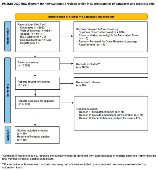 This systematic scoping review’s reports follow the guidelines of the PRISMA-ScR, which stands for the Preferred Reporting Items for Systematic Reviews and Meta-Analyses Extension for Scoping Reviews (Moher et al., 2010). In this study, the relevant literature was screened from four databases: Web of Science, Scopus, ScienceDirect, and IEEE Xplore. These databases were strategically selected to encompass multidisciplinary perspectives on educational technology, with Web of Science covering education and management sciences, Scopus providing wider global coverage of all types of academic publications, ScienceDirect indexing authoritative journals in computer science and educational engineering, and IEEE Xplore focusing on cutting-edge ICT research. The search date was 10 June 2025, and the search terms included “information and communication technology,” “technology,” “educational administration,” “school administration,” “higher education administration,” and “education management.”, etc. (see Table 1). PRISMA-ScR checklist, see Appendix A.