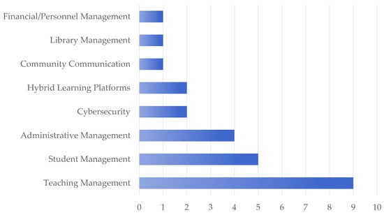 The most commonly addressed area in the studies is teaching management, appearing in nine studies, indicating its central role in technology application in school administration. These technologies include learning management systems, online course platforms, and teacher evaluation tools, which streamline teaching processes, improve student engagement, and enhance educational quality. Student management remains the second most frequent focus, appearing in five studies, reflecting expanded research on enrollment, attendance tracking, and academic progress monitoring through digital systems. Administrative management is explored in four studies, demonstrating growing interest in holistic administrative efficiency. Emerging areas such as cybersecurity and hybrid learning platforms are introduced in two studies, while community communication, library management, and financial/personnel management appear less frequently, with one study each (see Figure 5).